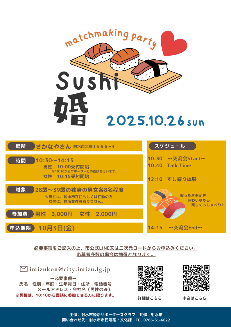<10/26(日)>Sushi婚 すし婚 イベント詳細 日付: 2025年10月26日 10:30 AM – 2:15 PM カテゴリ: 射水市 2025-10-21 | 関連記事 <11/15(土)>恋活♥謎解きミュージアム <12/13(土)>キラ恋♥XMAS Party 【終了しました】<10/19(日)>“察する”文化と人間の品格 【終了しました】<10/19(日)>CROSSLAND TOWER PARTY ♡女性追加受付中♡ <10/26(日)>Sushi婚 すし婚